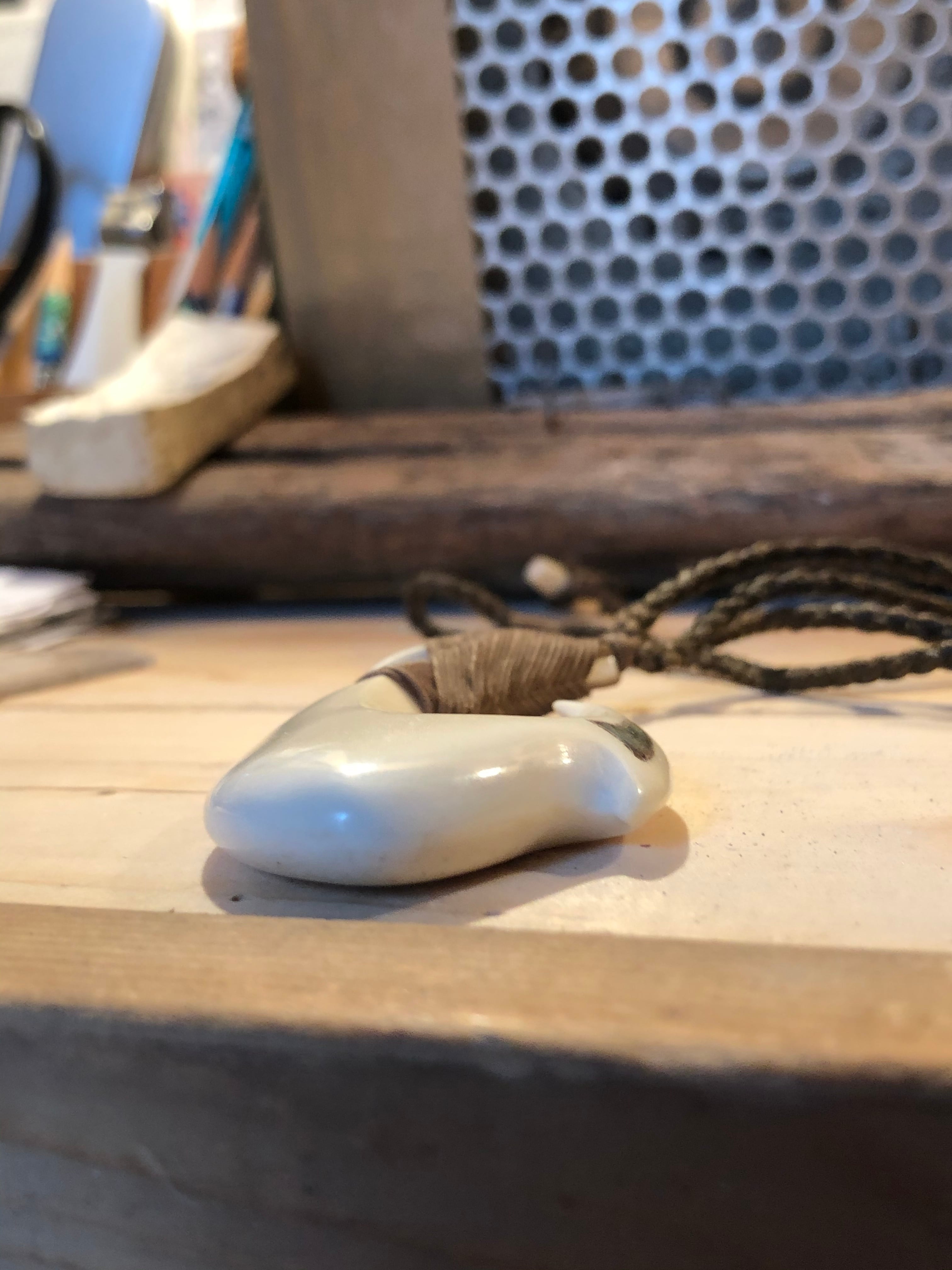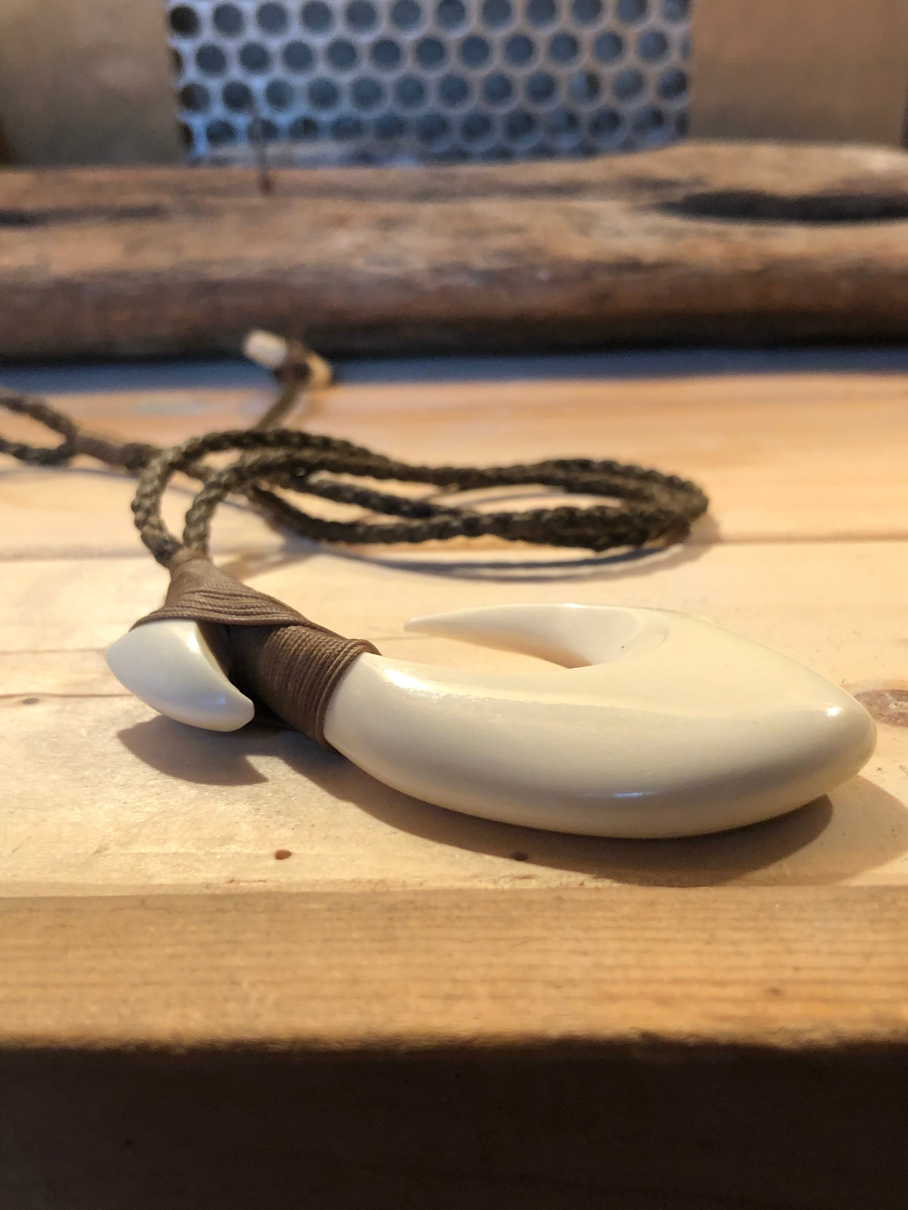 トップは、牛骨を使った釣針の形で、紐は皮細工などで使われる
