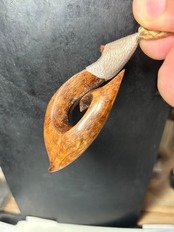 トップは、コアウッドを使った釣針の形で、紐は皮細工などで使われる丈夫なシニューを編み込んでいます。