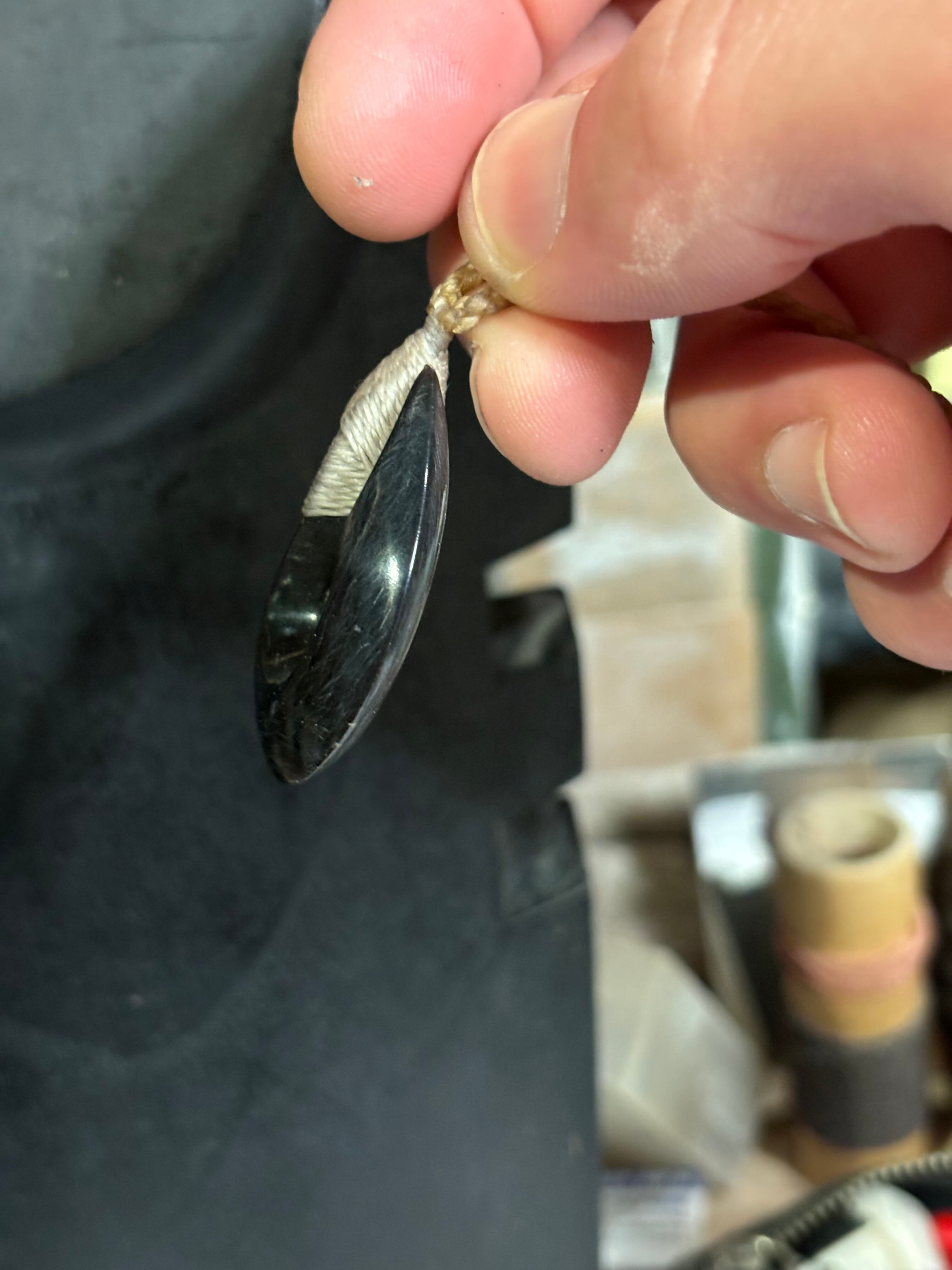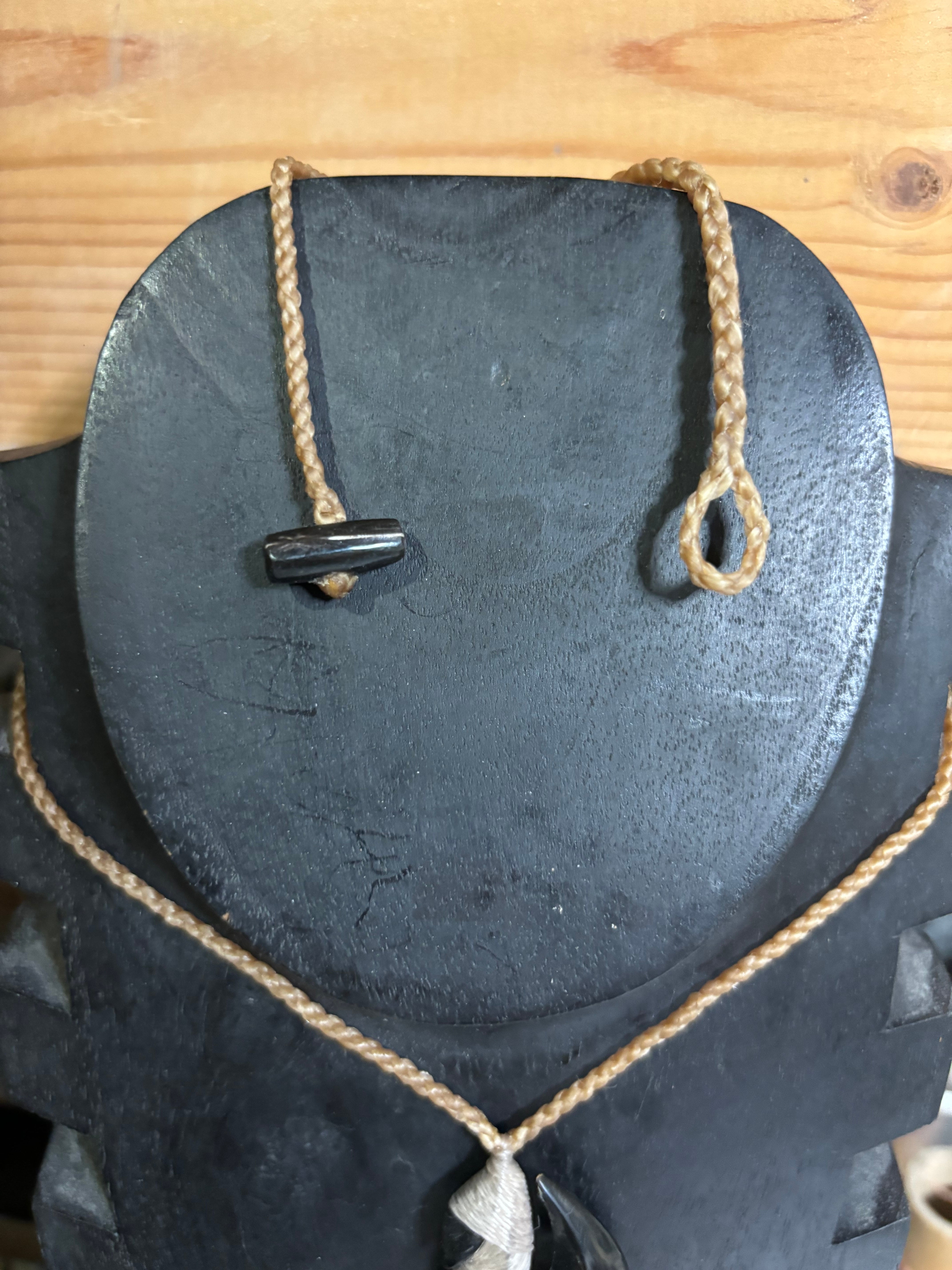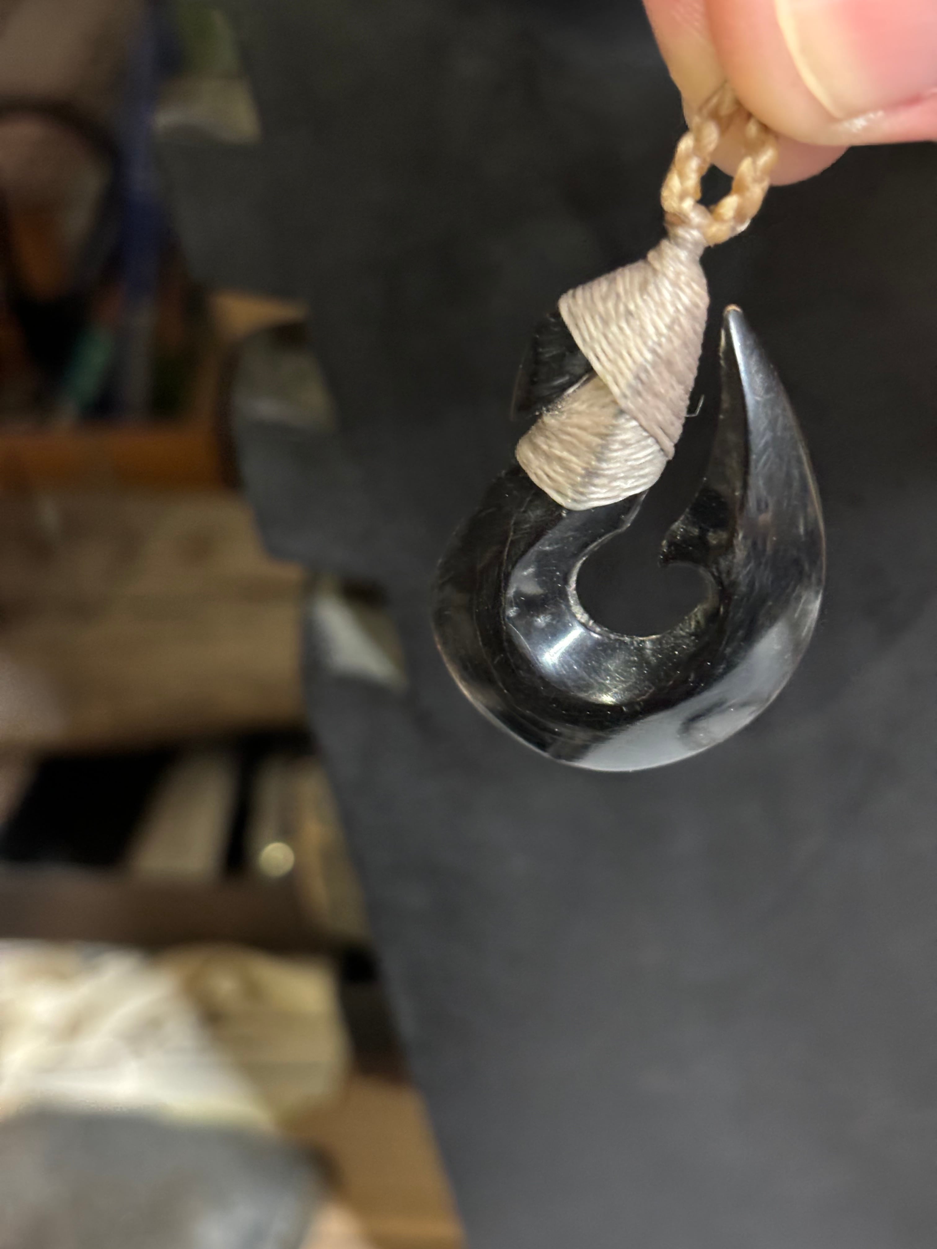 トップは、水牛の角を使った釣針の形で、紐は皮細工などで使われる丈夫なシニューを編み込んでいます。