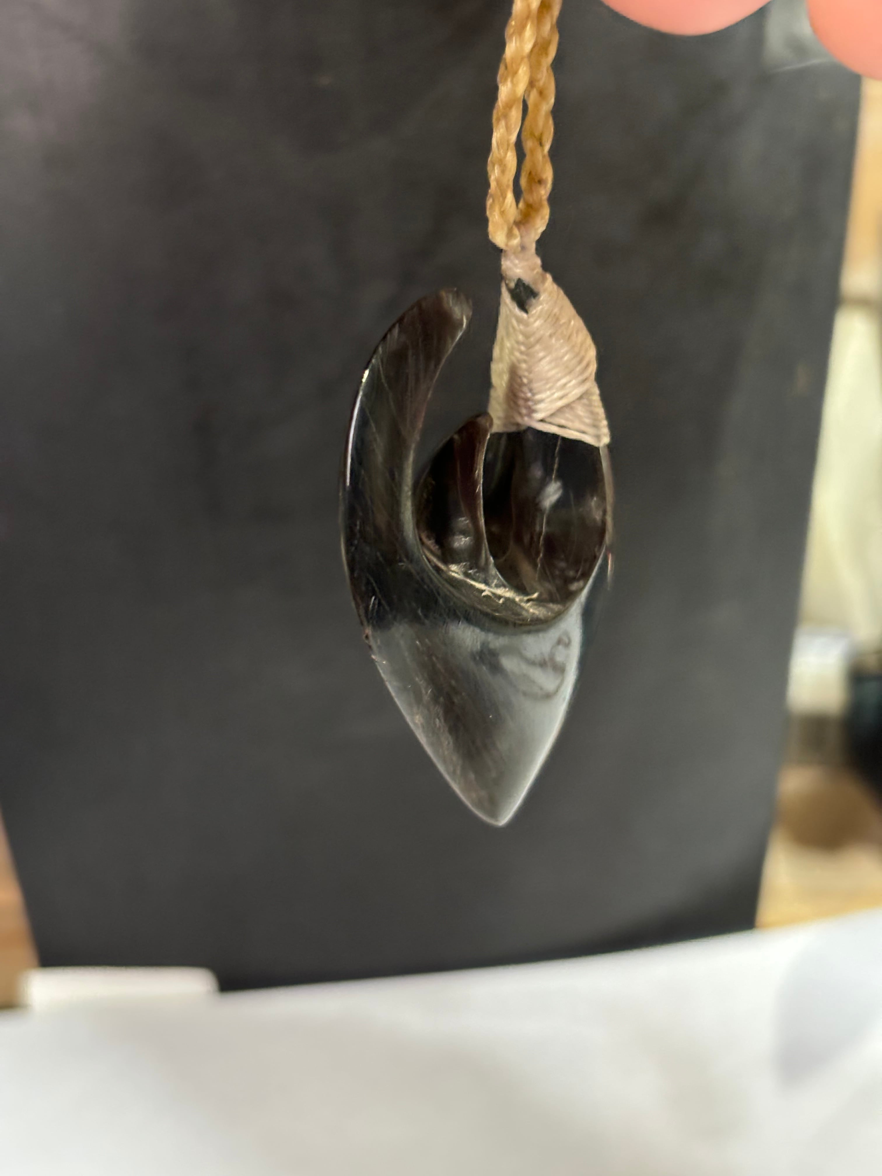 トップは、水牛の角を使った釣針の形で、紐は皮細工などで使われる丈夫なシニューを編み込んでいます。