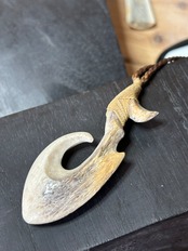 トップは、マッコウクジラの肋骨を使った釣針の形で、紐は皮細工などで使われる丈夫なシニューを編み込んでいます。